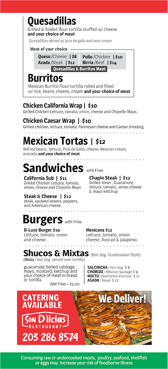 From a reviewer’s perspective, the menu at Son D'licias Restaurant at 115 New Canaan Ave feels like a thoughtful culinary tour through Latin America, bringing together Mexican, Guatemalan, and Peruvian flavors under one roof. The experience often begins with crowd-pleasing appetizers such as Nachos, Picada, 6 Piece Chicken Wings W/ Fries, Papas Fritas, and Salchi Papas, which set a casual, shareable tone. For something lighter, the salad selection-De La Casa Salad, Taco Salad, Avocado Salad, and Caesar Salad-offers fresh balance before moving into heartier dishes.
