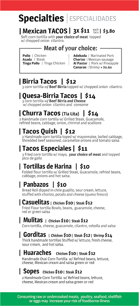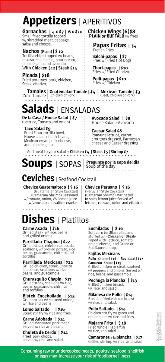 The menu truly shines in its specialties, especially the taco lineup, where Mexican Tacos, Birria Tacos, Quesa-Birra Tacos, Churra Tacos, and Tacos Quish highlight bold seasonings and comforting textures. Seafood lovers are not overlooked, with Chevice Guatemalteco and Chevice Peruano delivering bright, citrus-driven flavors. On the grill side, traditional platters like Parrillada Chapina, Parrillada Mexicana, Churasquito Chapin, Bistek Encebollado, and Carne Adobada showcase the restaurant’s strength in grilled and sautéed meats.